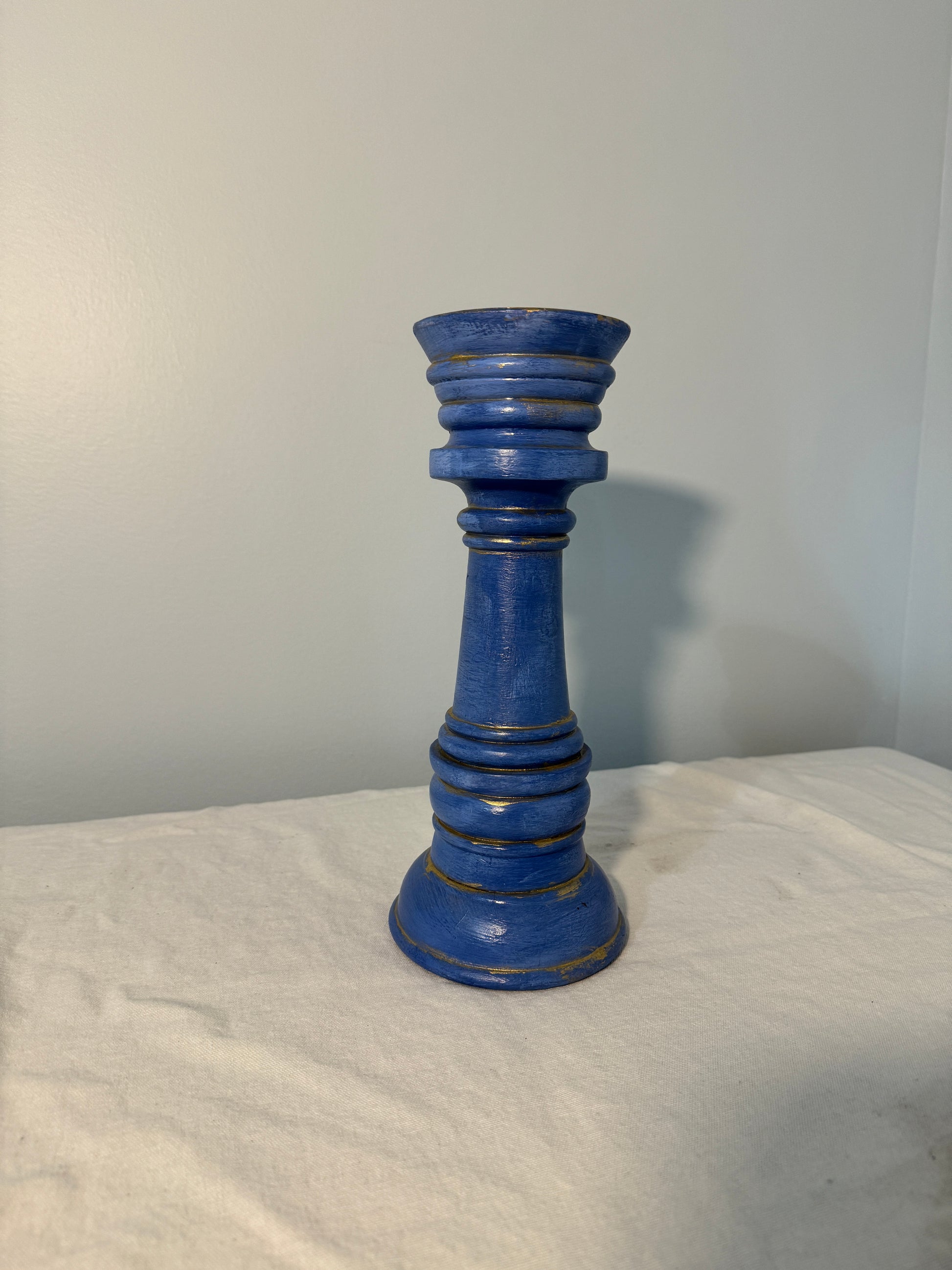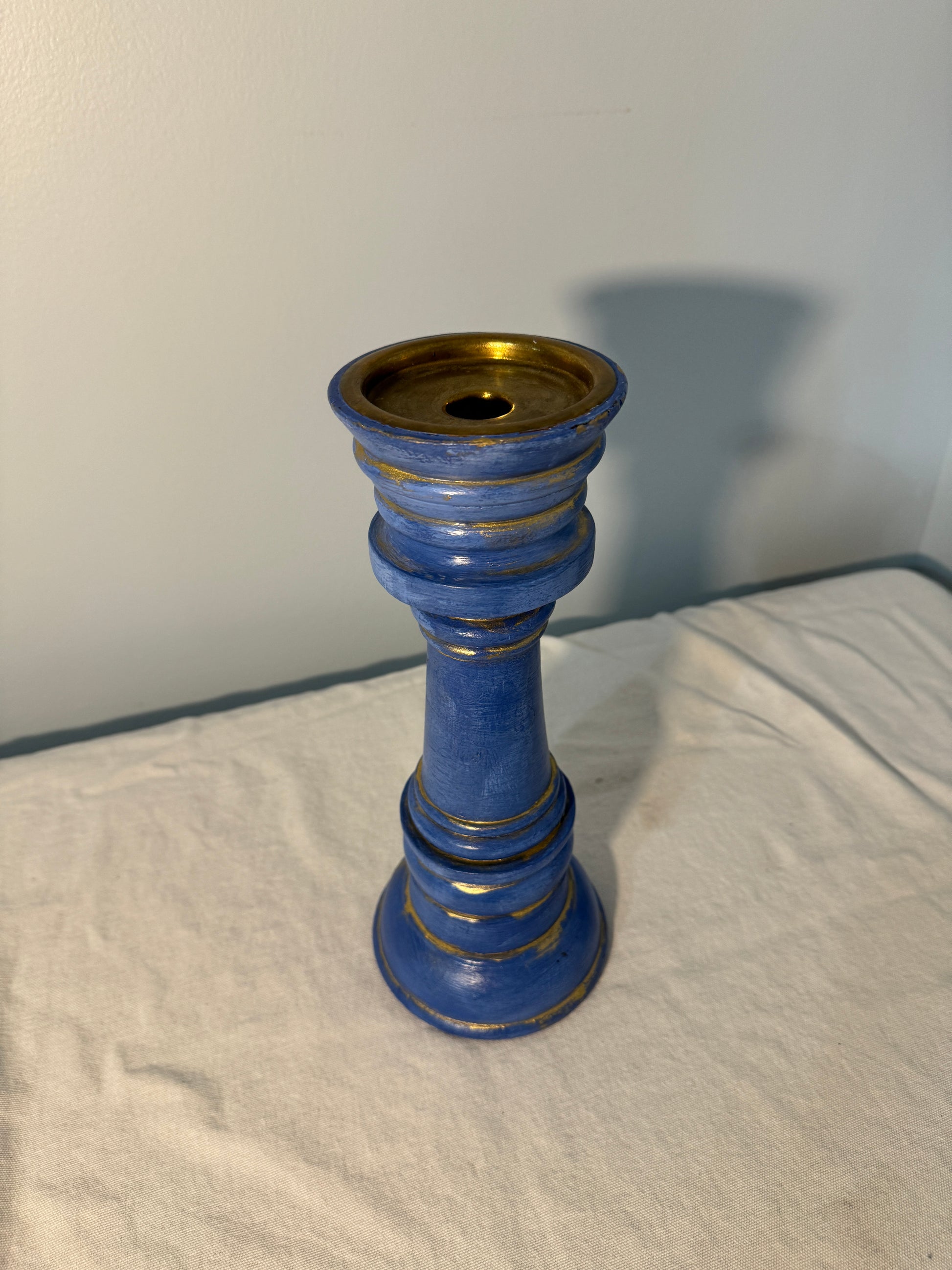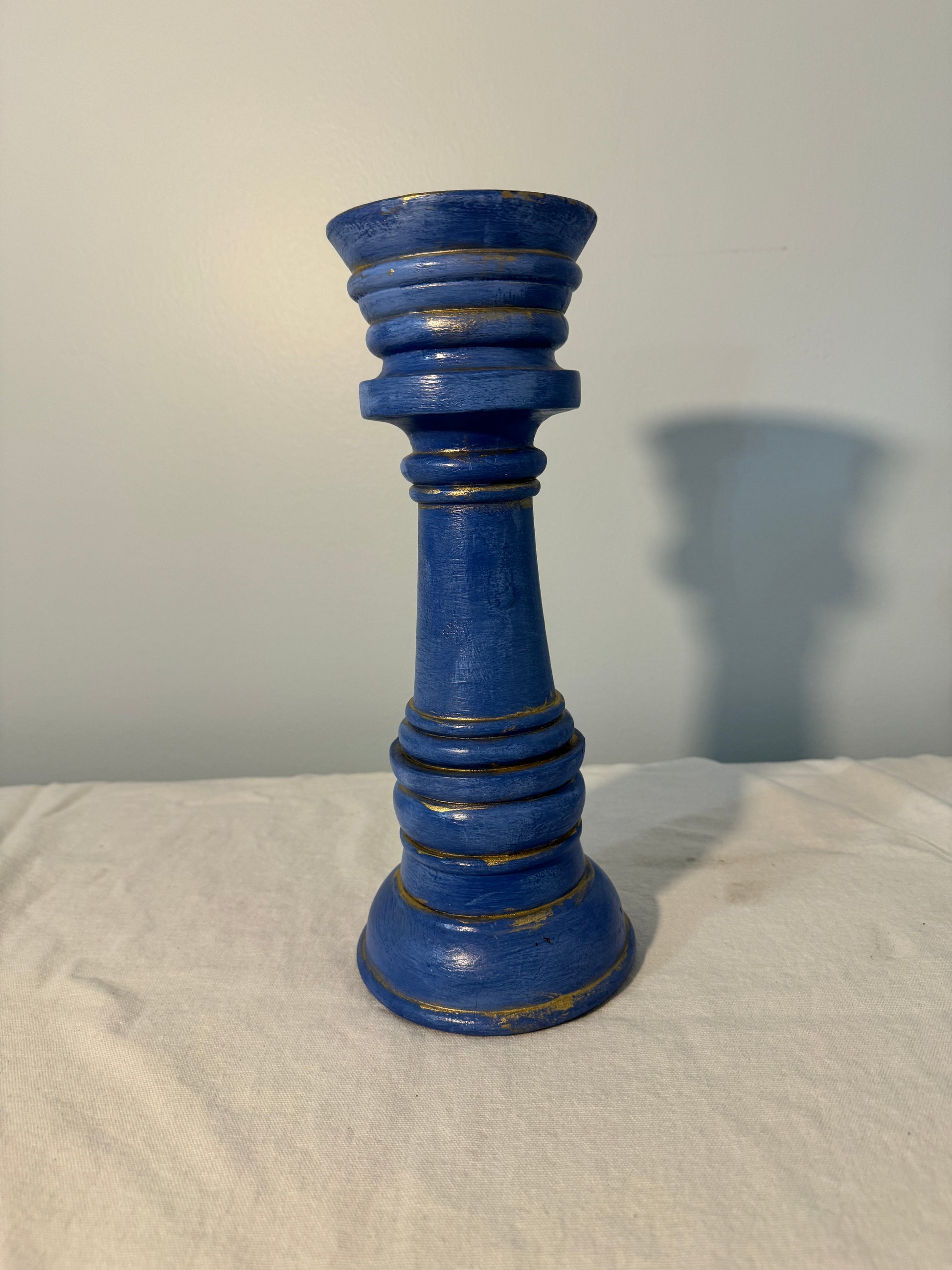 This is a repainted antd repurposed candlestick holder finished in a deep blue color with gold highlights. The design features a classic,tapered shape with ridges and grooves that add depth to its appearance. The gold accents highlight its contours, giving it an antique or vintage-inspired aesthetic. It would make a great decorative piece for a classic or bohemian-style home decoe setting.