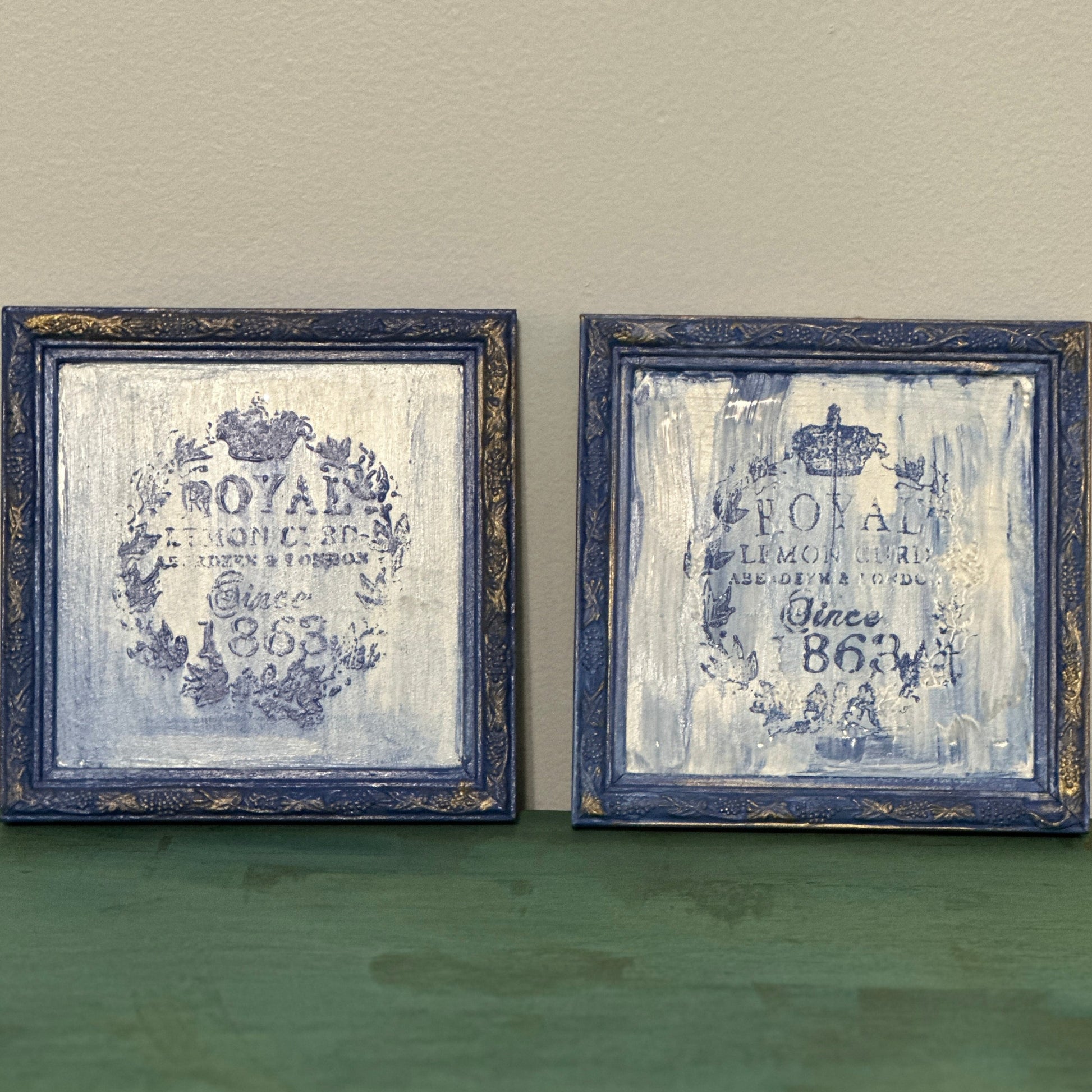 Add a touch of vintage elegance to your space with this 2 pc wall art set. Featuring distressed blue and gold frames, these handcrafted peices showcase beautifulljy stenciled artwork with regal desigh, reminiscent of classic European decoe. The aged finish and intricate detailing give these peices a timeless charmk, perfect for adding chaacter to any romm. Ideal for farmhouse, shabby chic, or antique-inspired interiors.