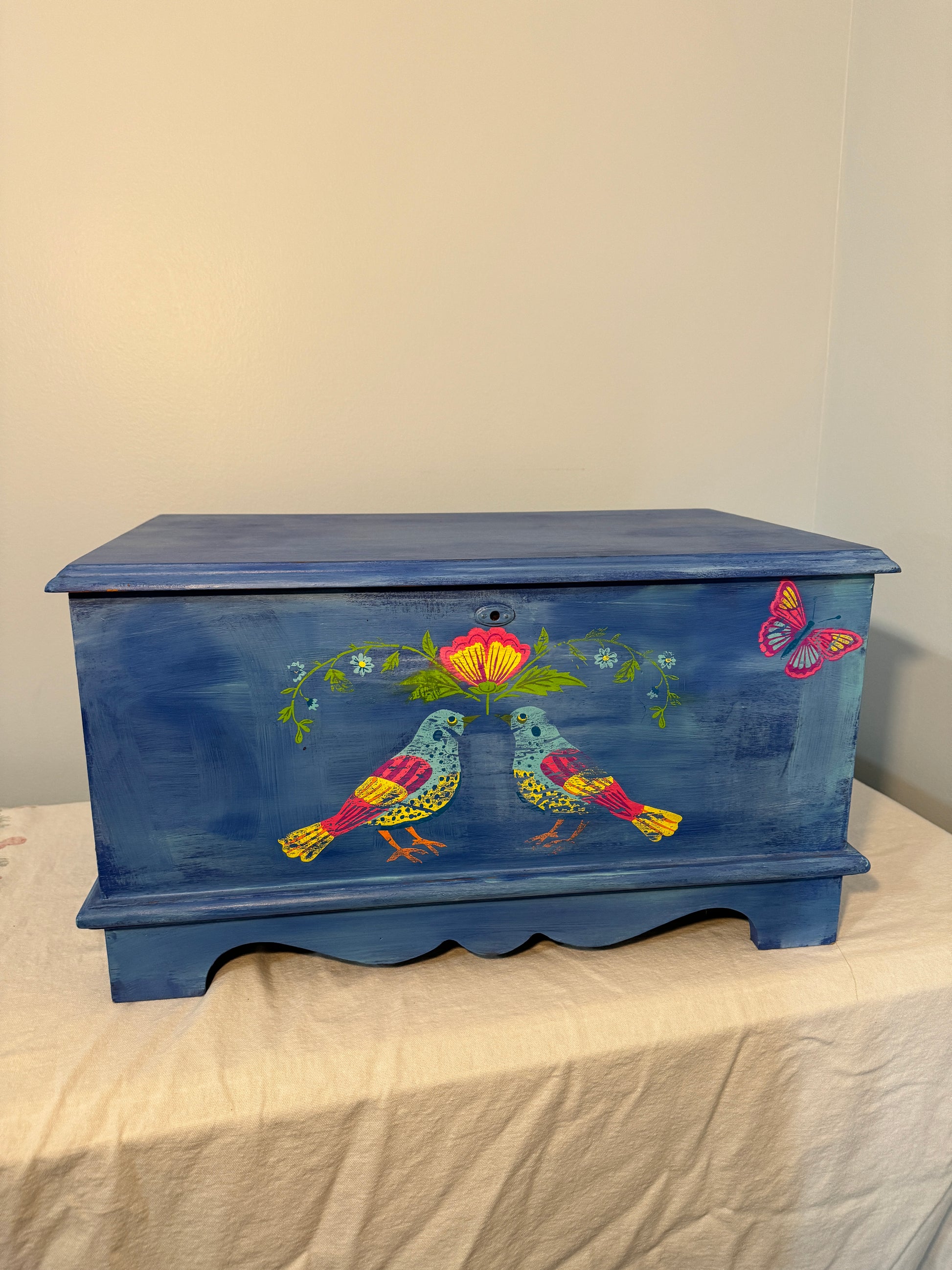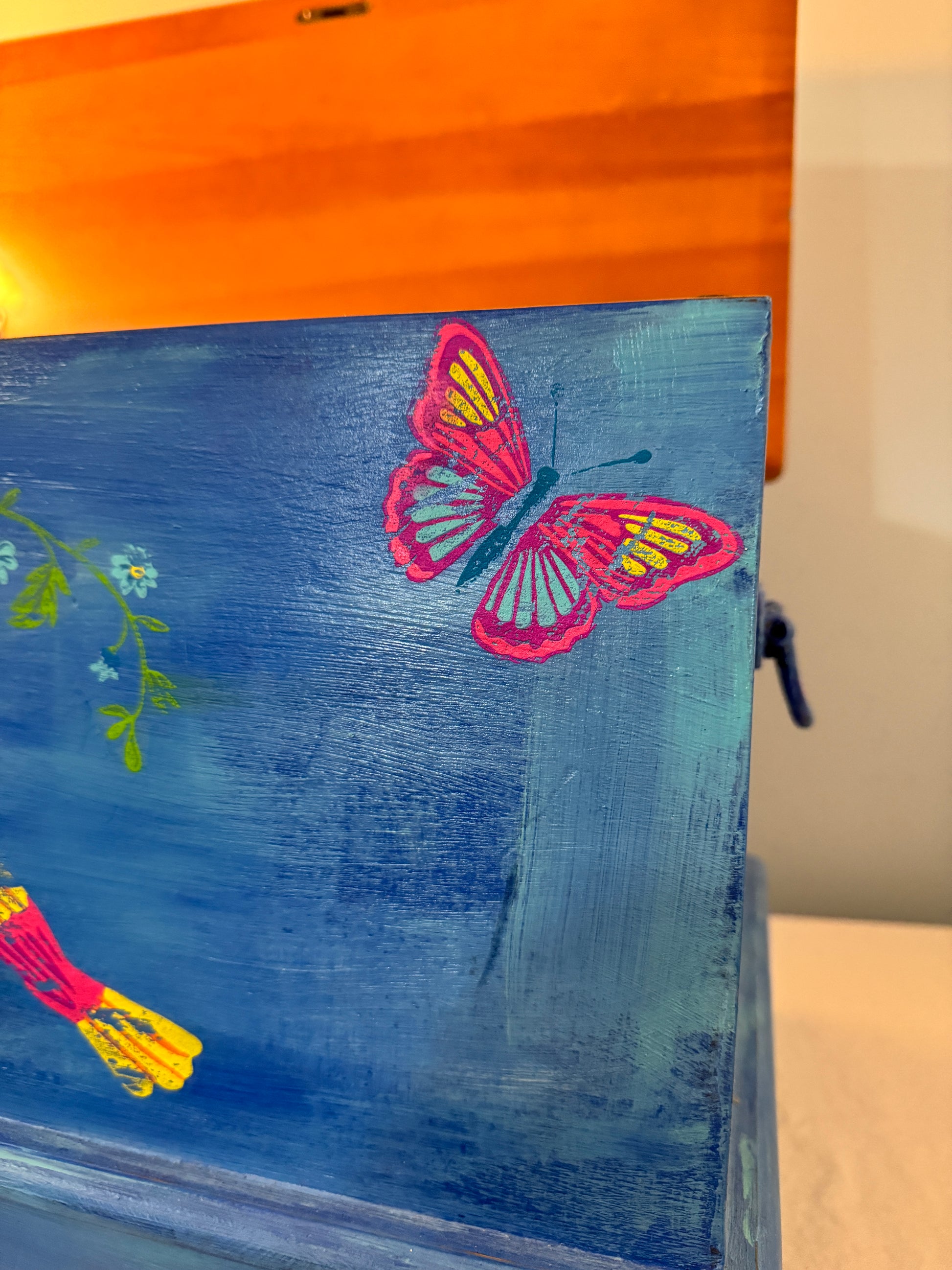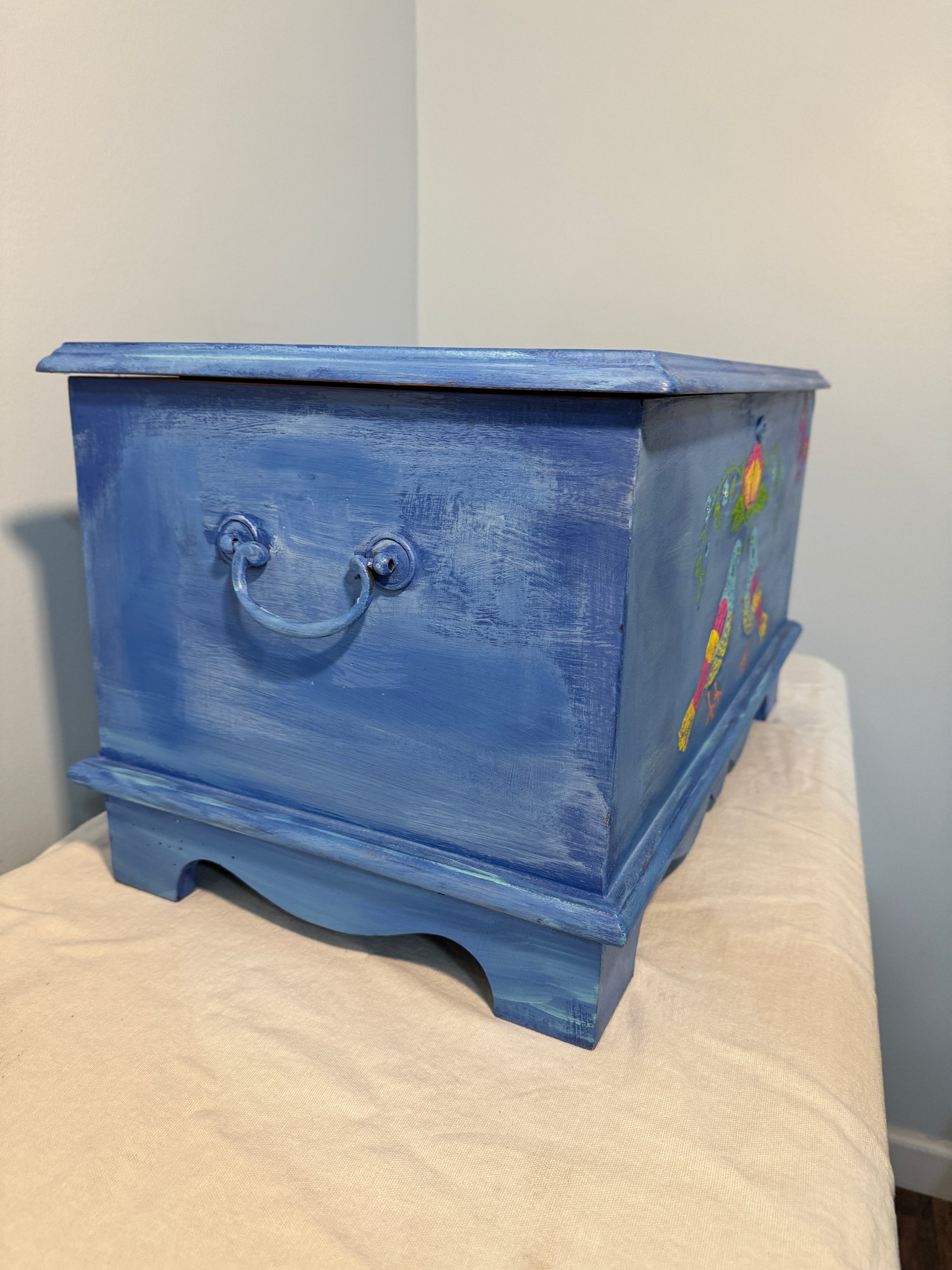 This is a stunning hand-painted piece that blends vintage charm with artistic elegance . Crafted with DIY Paint products and enhanced with IOD Paint inlay (Vida Flora) This storage chest showcases a deep, rich blue finish adorned with intricate floral an bird motifs, evoking a sense of nature's beauty and bohemian spirit.The patina finish gives it an heirloom feel, making it a statement piece for any home.