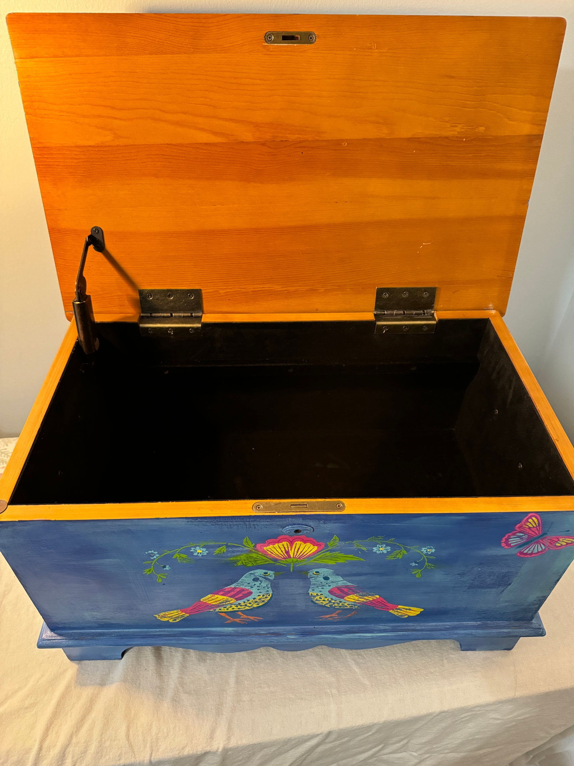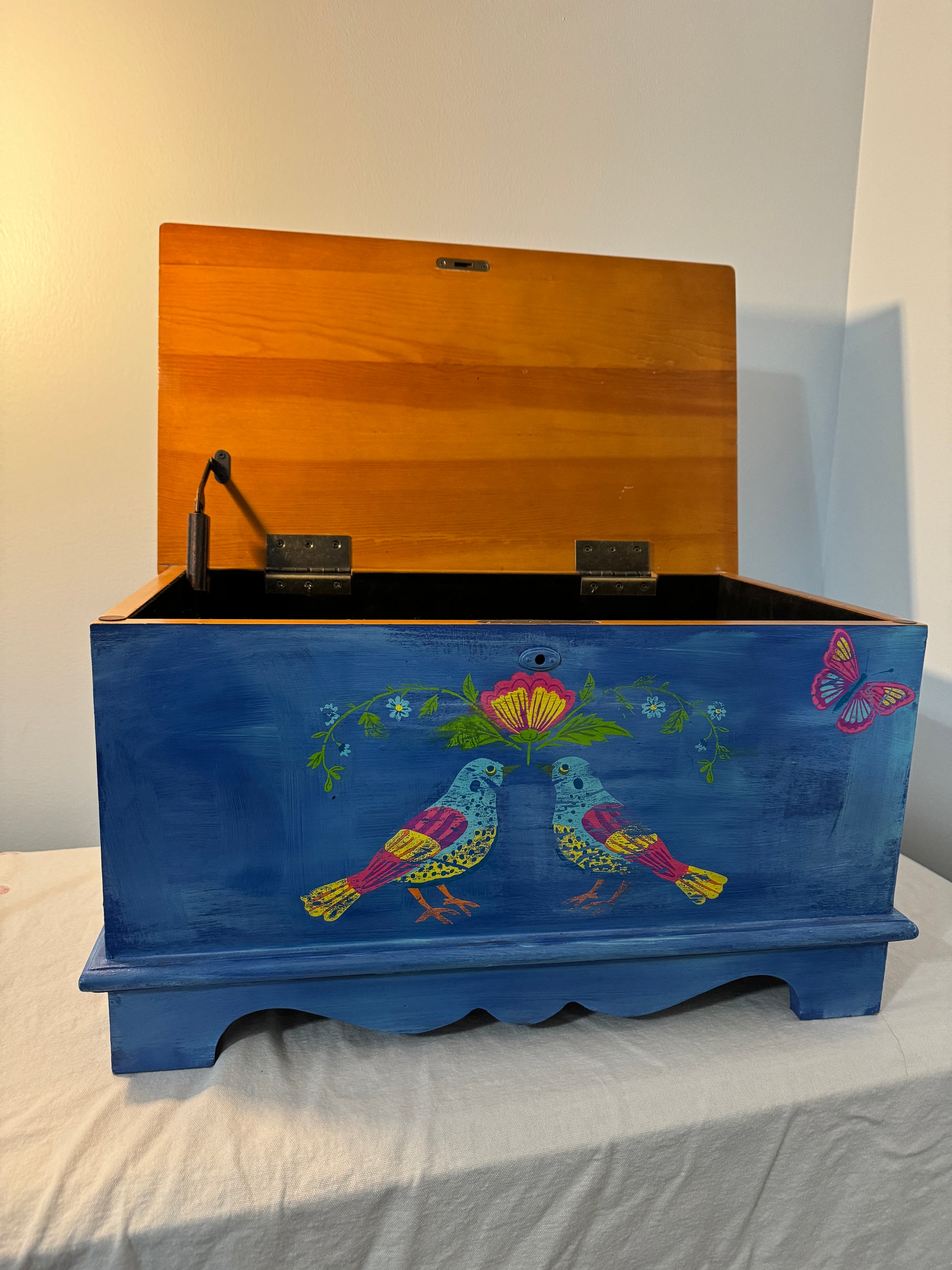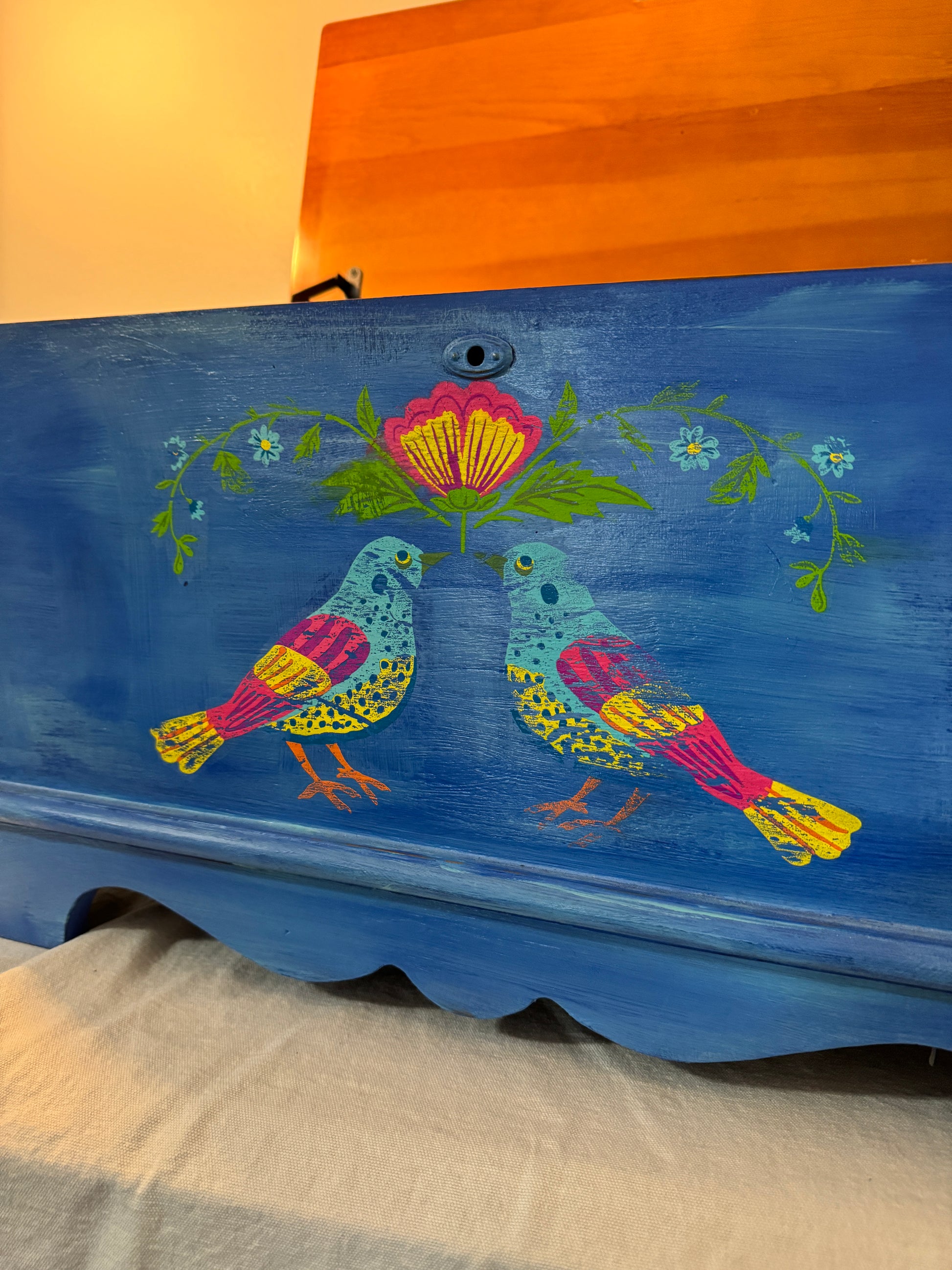 This is a stunning hand-painted piece that blends vintage charm with artistic elegance . Crafted with DIY Paint products and enhanced with IOD Paint inlay (Vida Flora) This storage chest showcases a deep, rich blue finish adorned with intricate floral an bird motifs, evoking a sense of nature's beauty and bohemian spirit.The patina finish gives it an heirloom feel, making it a statement piece for any home.