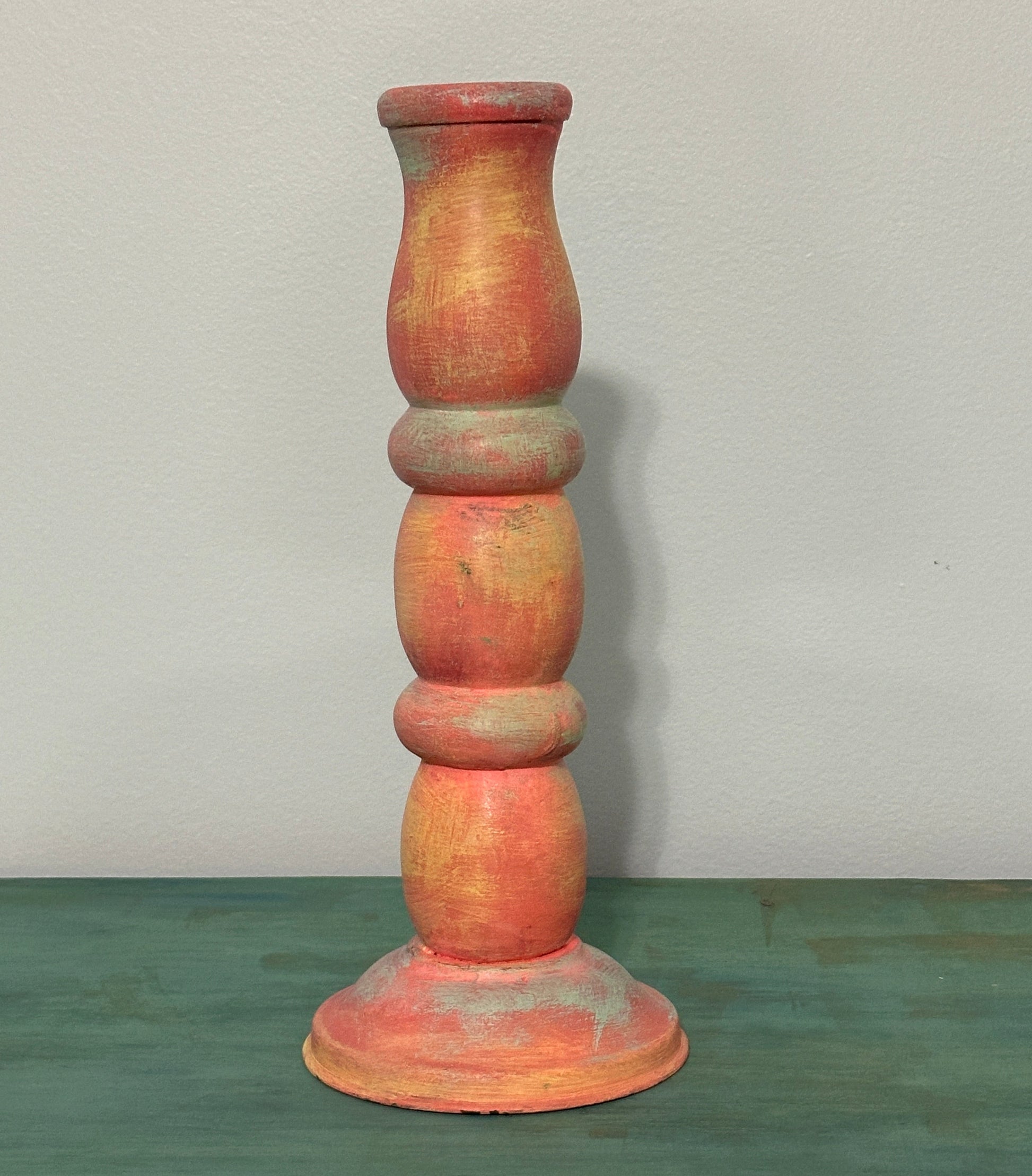 This beautifully hand-painted candlestick radites warmth with its rich blend of burnt orange , golden hues, and soft rustic distressing. reminiscent of a glowing sunset. Its brings a cozy, vintage charmto any space. Its a perfect accent peice for a boho, or antique-inspired decor.