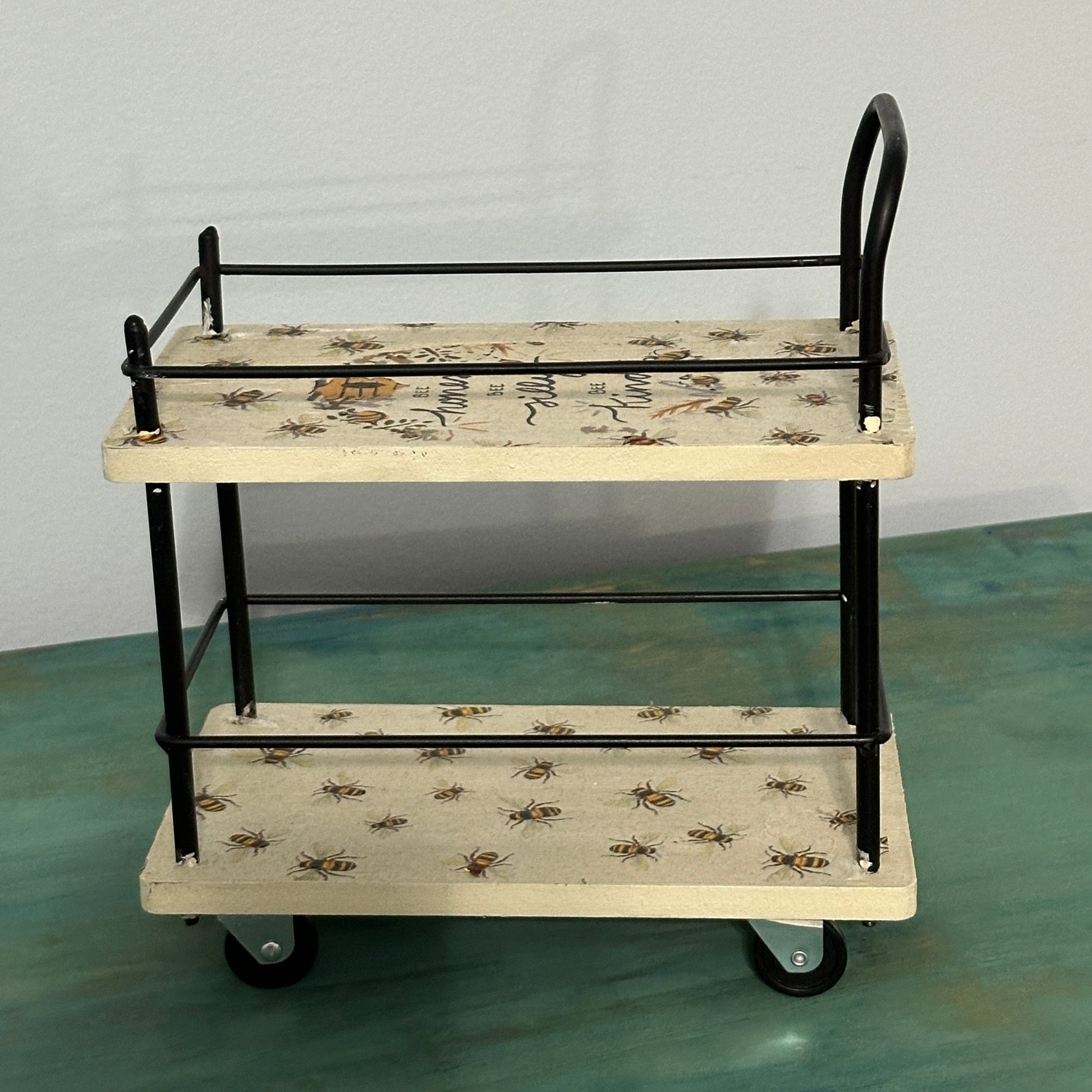 Add a touch of charm and functionality to your space with this mini cart that has a decoupaged bee-themed design , it's both stylish and practical.