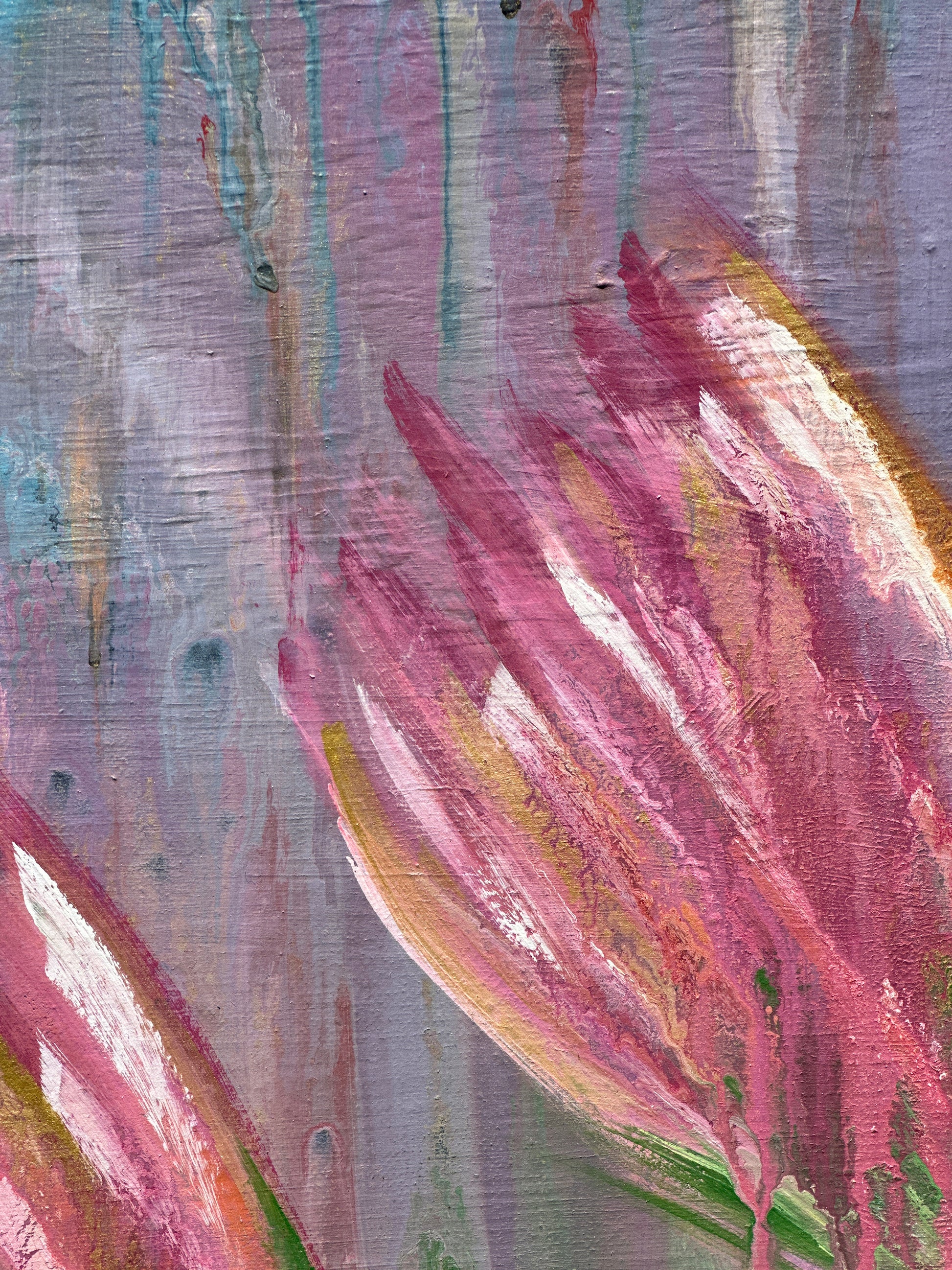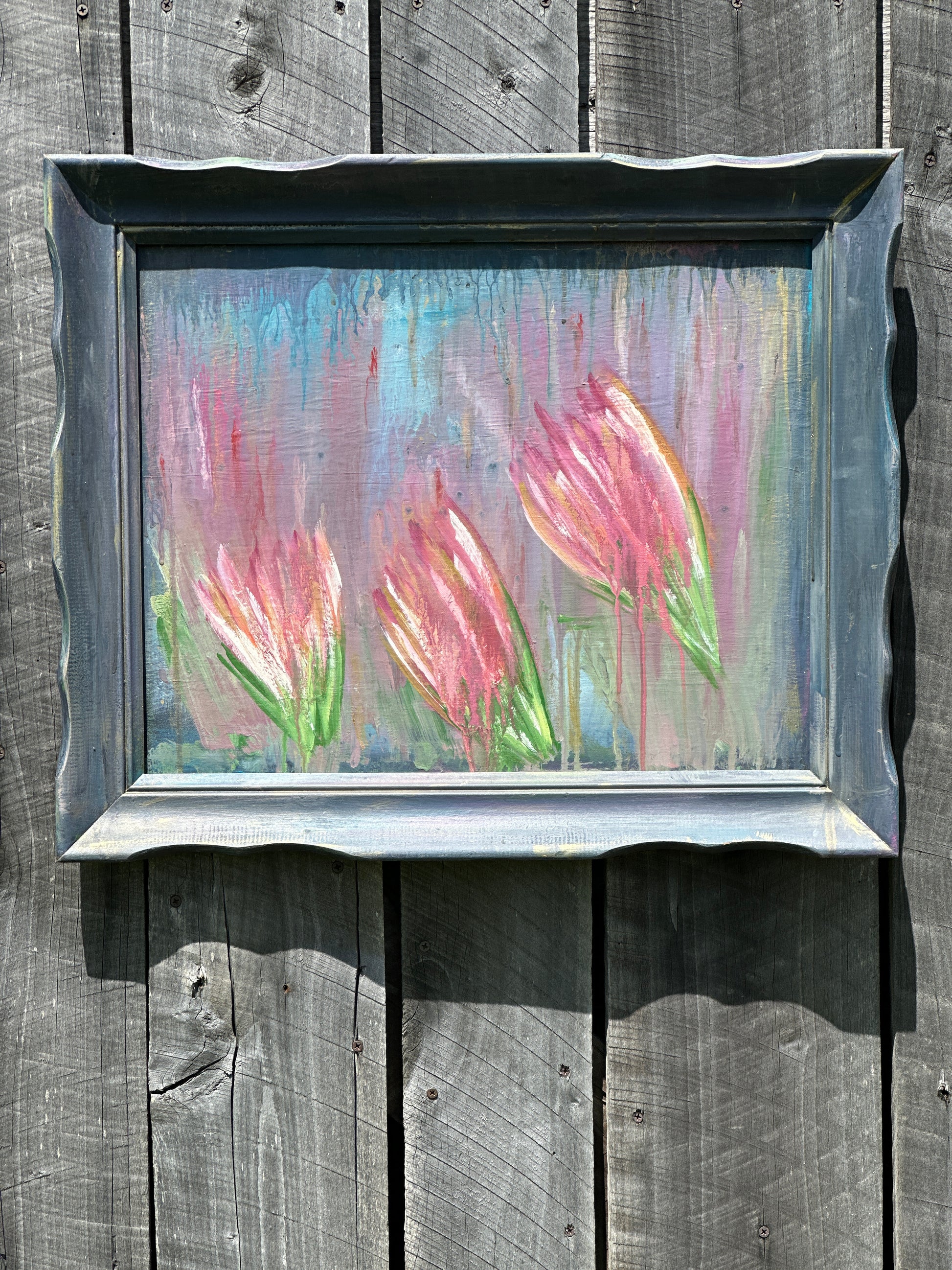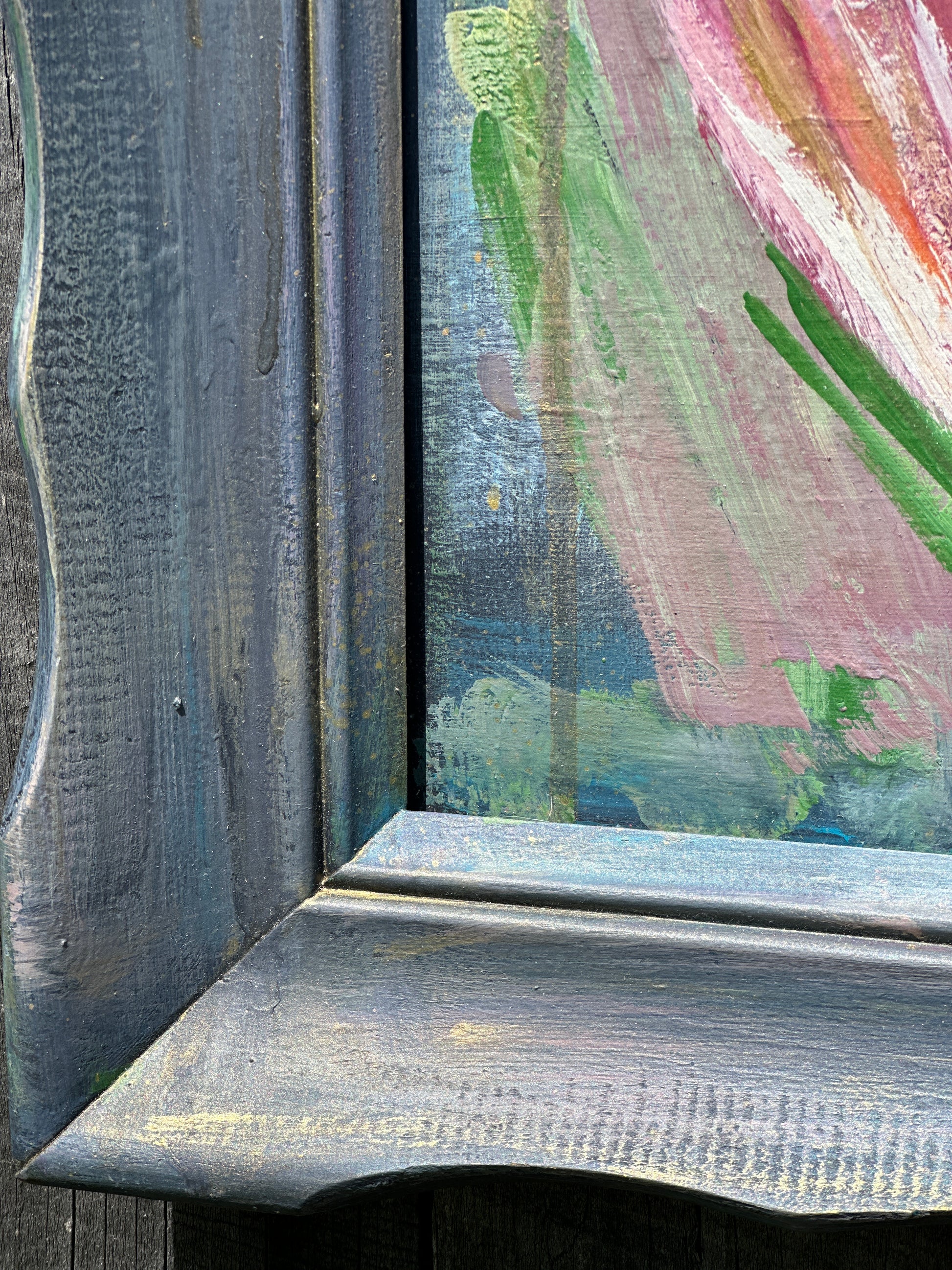 These pink flowers with a dark blue and gold frame are a vintage repurposed hand painted piece. The delicate color contrast between pink and blue adds a touch of sophistication to any room. Expertly crafted, this piece brings a touch of elegant art into your home.