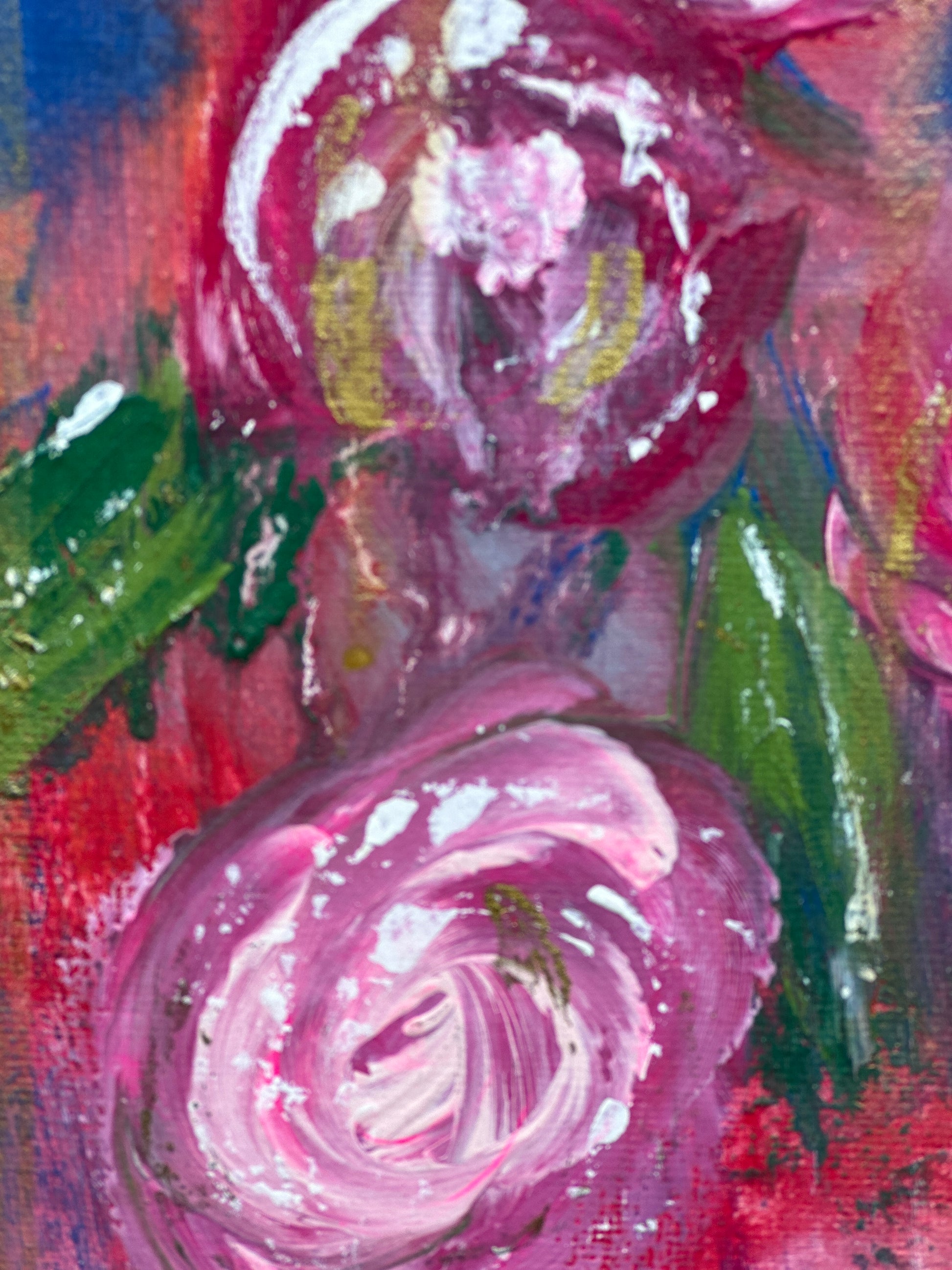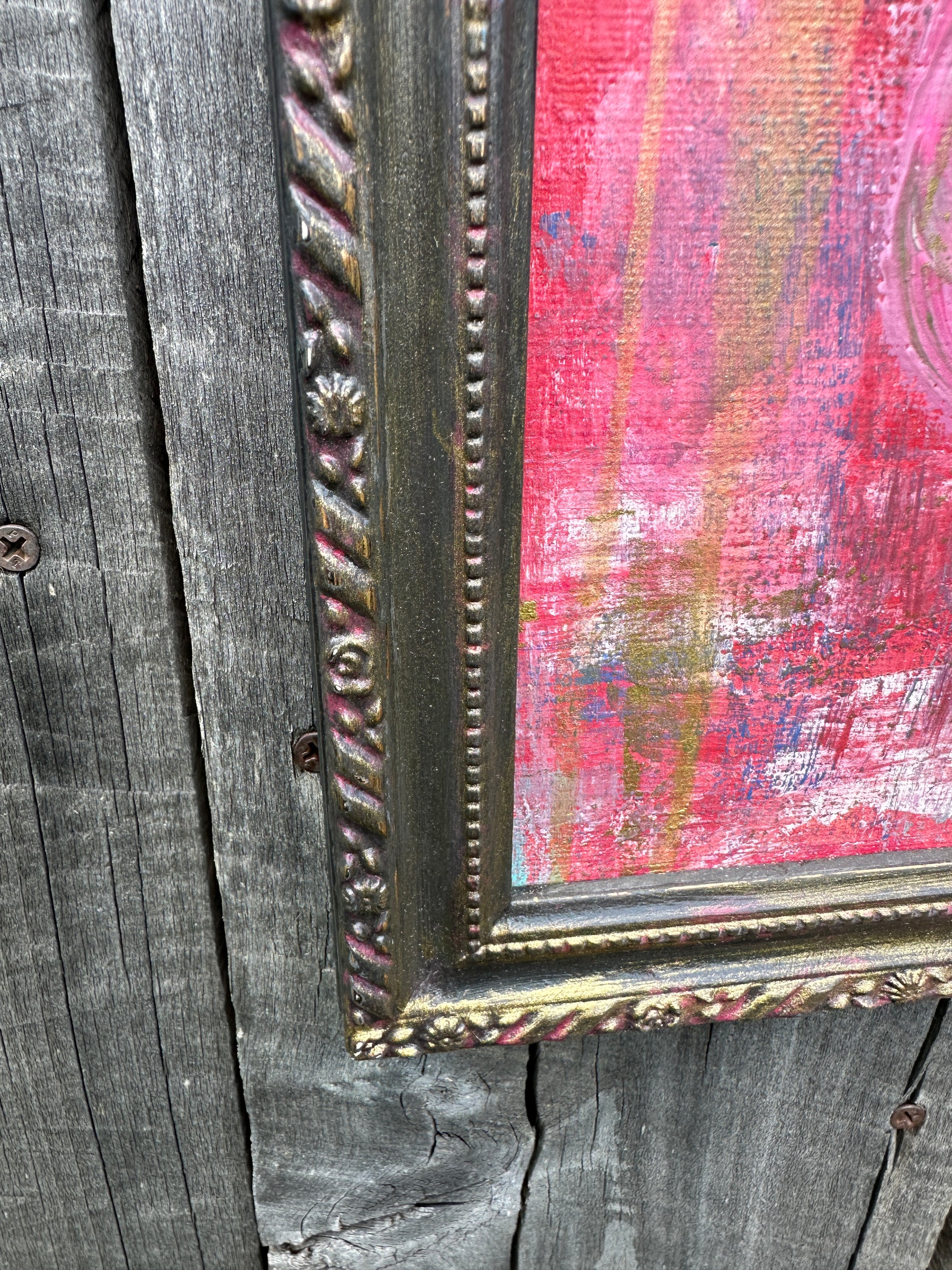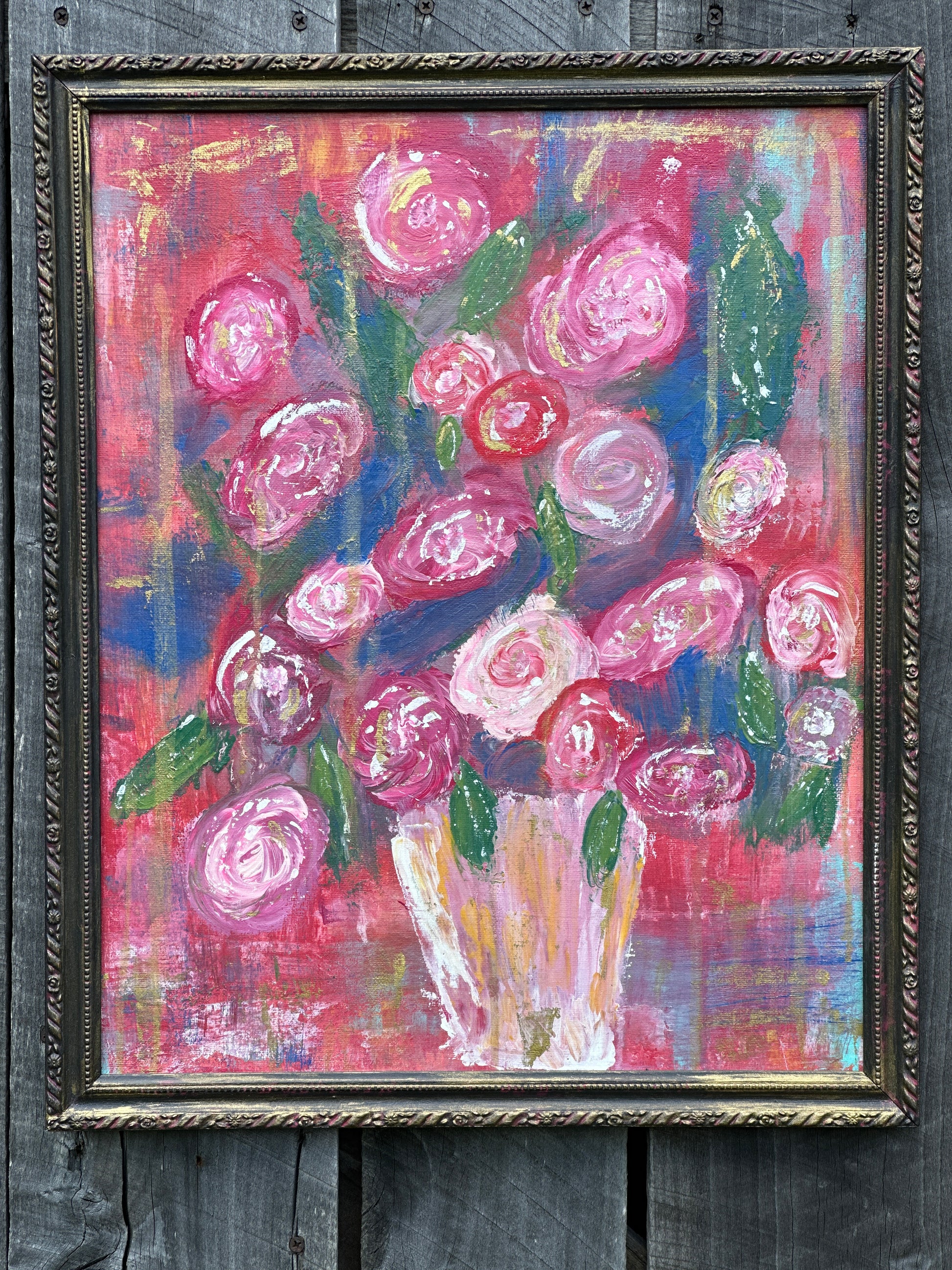 This PINK Flowers painting features a vintage, repurposed hand painted design with a plethora of bright pink flowers The dark blue and gold painted frame adds a touch of elegance and complements the colorful composition. A stunning addition to any art collection.