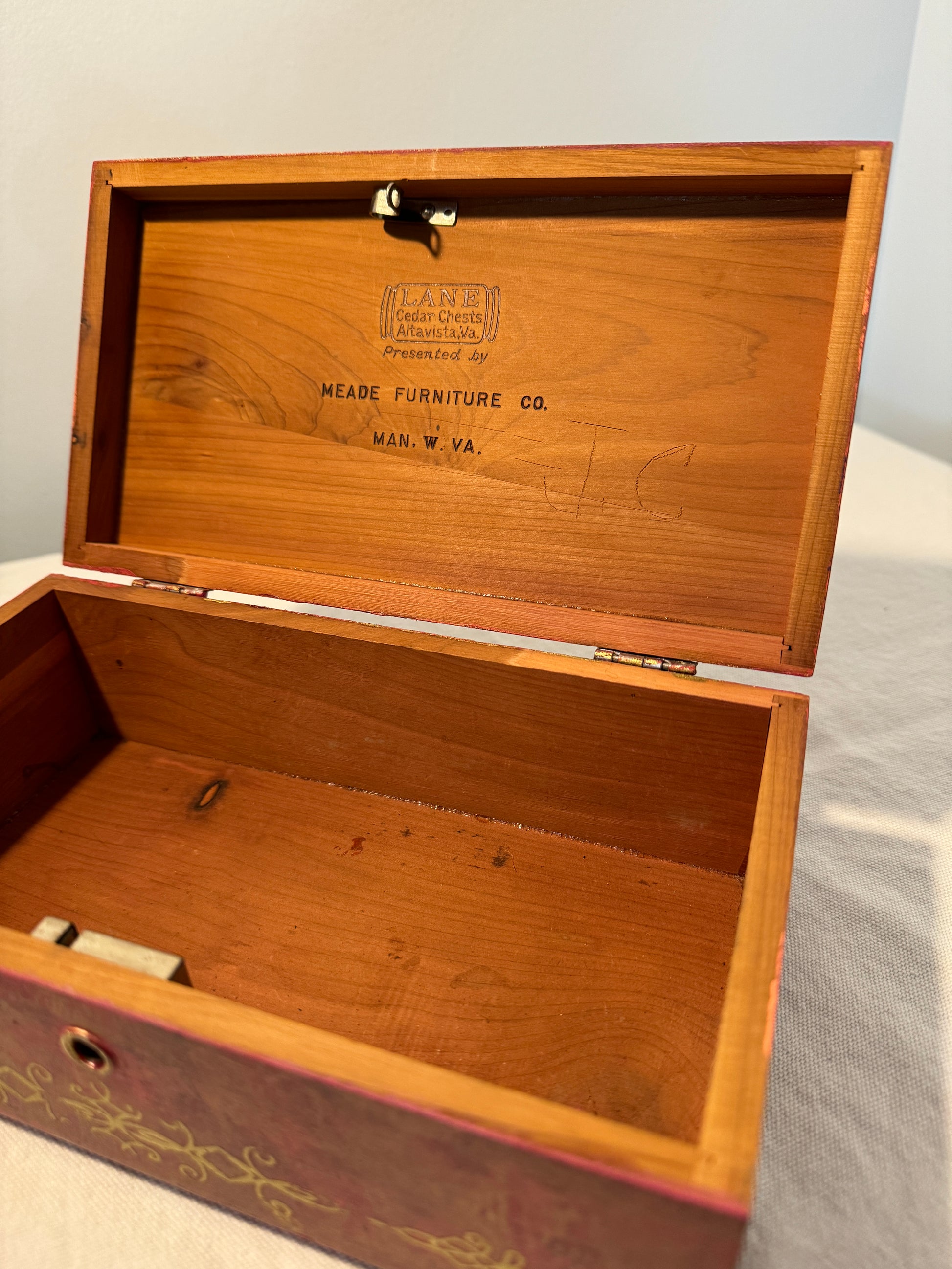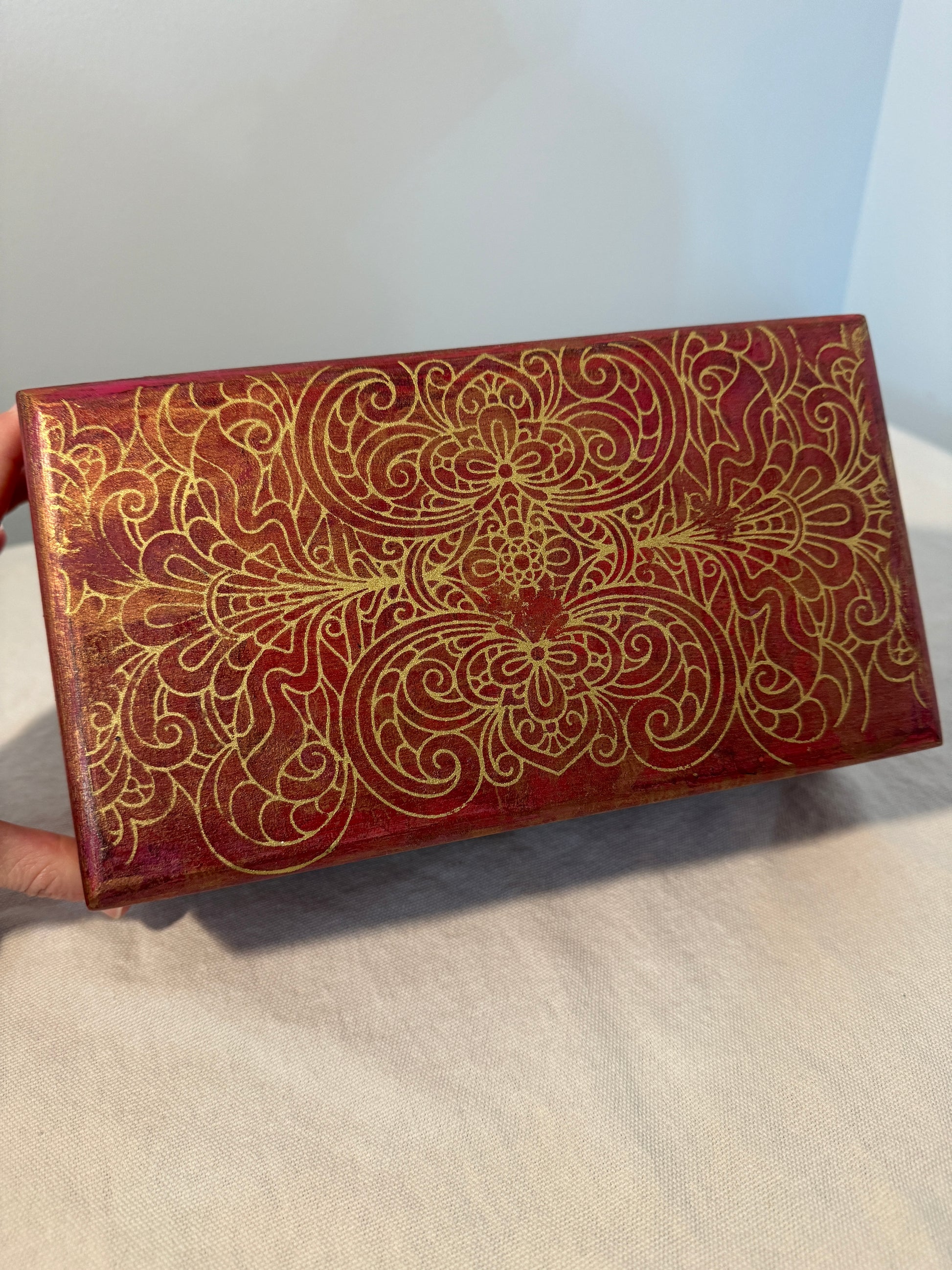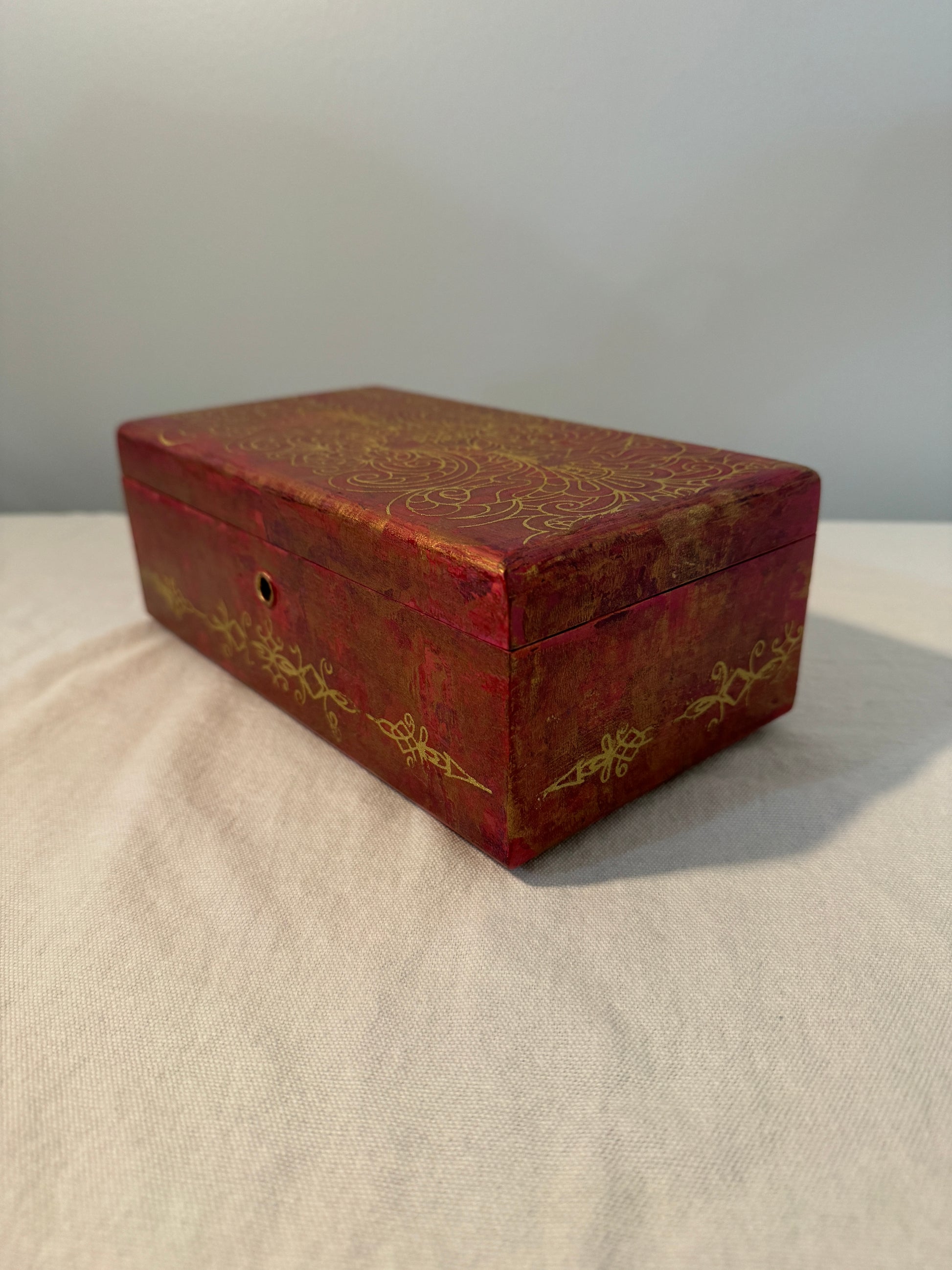 This vintage pink box has been lovingly repurposed and hand-painted with DIY petticoat pink, golden ticked Big top colors. Measuring at 3 7/8 inches x 9 inches x 5 inches, this mini jewelry chest adds a touch of charm to any space. Each piece is unique and sure to be a treasure for years to come.