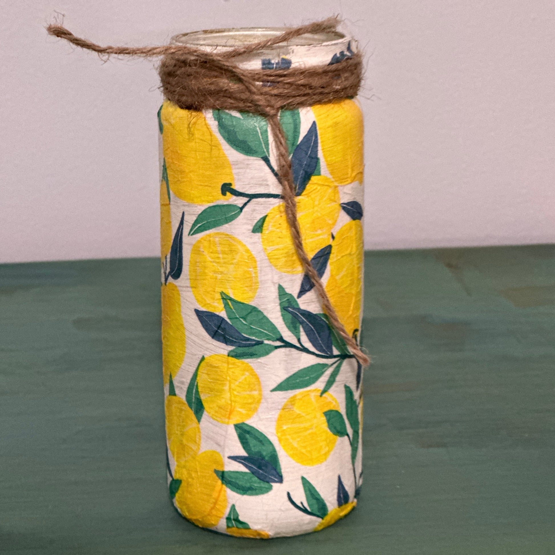 This yellow lemon jar is a decoupaged glass jar, perfect for storage and organization. Its unique design adds a touch of brightness to any room, while also providing a sturdy and functional storage solution. Made with high-quality materials, it is both durable and stylish.